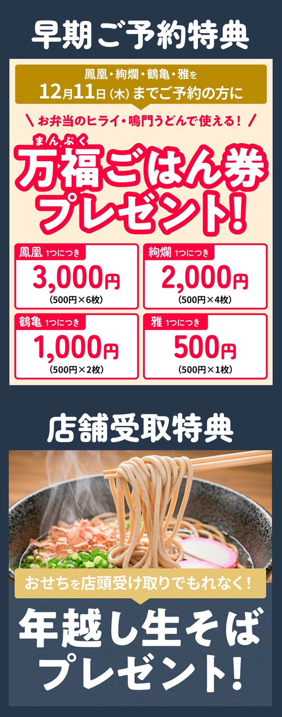 店舗受取の場合、年越しそば(3人前)をおせち1個につき1つプレゼントいたします。